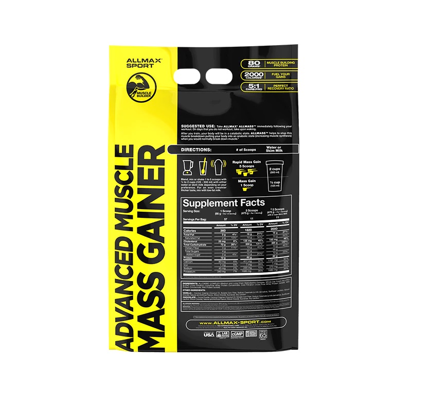 گینر آل مس آلمکسگینر آل مس آلمکس 2000 کالری و 80 گرم پروتئین به بدن ارائه میدهد و یکی از بالاترین میزان پروتئین هارا در میان گینر ها دارد.گینر آل مس Allmax به جلوگیری از تجزیه عضلات پس از تمرین کمک می کند و بدن شما را در حالت آنابولیک قرار می دهد ( افزایش سنتز عضلات ) .
