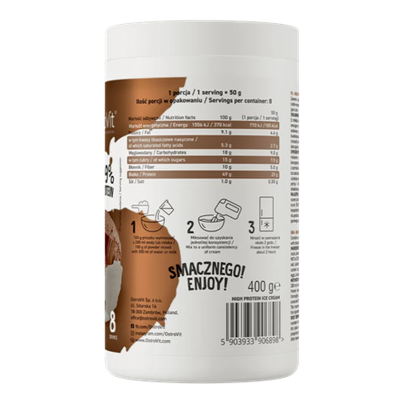 بستنی پروتئینی که توسط OstroVit ساخته شده است مکمل کاملی برای رژیم غذایی حاوی پروتئین است. 100 گرم از این محصول 49 گرم پروتئین به بدن می رساند که آن را به یک بمب پروتئینی واقعی تبدیل می کند. برخلاف بسیاری از بستنی های موجود در فروشگاه ها، بستنی استرویت حاوی چربی بسیار کمی است و قند اضافی ندارد. همچنین به دلیل محتوای فیبر رژیمی بالا از سایر محصولات متمایز می شود و حتی احساس سیری طولانی را تجربه خواهید کرد.
